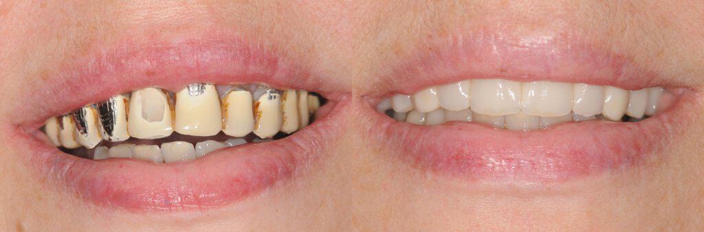 4. U slučaju parodontoze uzrokovane lošom higijenom, potrebno se za terapiju obratiti stručnjaku, koji će vam uz provedbu terapije objasniti kako se sami možete bolje brinuti za zdravlje svojih zuba i zubnog mesa kroz odgovarajuće postupke vezane za oralnu higijenu (pravilno četkanje, čišćenje zubnim koncem i međuzubnim četkicama, ispiranje antiseptičkim tekućinama, korištenje tuša za zube i sl.). Najvažnija osoba u ovoj vrsti terapije nije terapeut, to ste Vi sami. Ako je zbog parodontoze došlo do „povlačenja“ zubnog mesa i izlaganja/ „vidljivosti“ metalnog ruba krunice, potrebno je napraviti parodontnu terapiju. Nakon oporavka, moguće je napraviti bezmetalne krunice (cirkon keramičke ili pune keramičke) koje ne sadrže metale (Slika 4). Stare metalne nadogradnje u nekim je slučajevima moguće izvaditi i zamijeniti ih estetskim intrakanalnim nadogradnjama- kolčićima od kompozitnih vlakana koji su boje zuba. Ako vađenje istih nije moguće, odgovarajućom vrstom krunica može se „maskirati“, odnosno prekriti područje nadogradnje i tako postići odgovarajuću željenu boju.