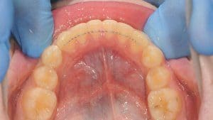 • FIKSNI RETAINER je posebna žica koja se zalijepi s unutarnje strane zuba, obično na donjoj čeljusti. Nošenje ove vrste retainera je za pacijenta nešto ugodnije nego kod mobilnih retainera, jedino na što se treba obratiti posebna pažnja je higijena donjih sjekutića s unutarnje strane (Slika 1. ).